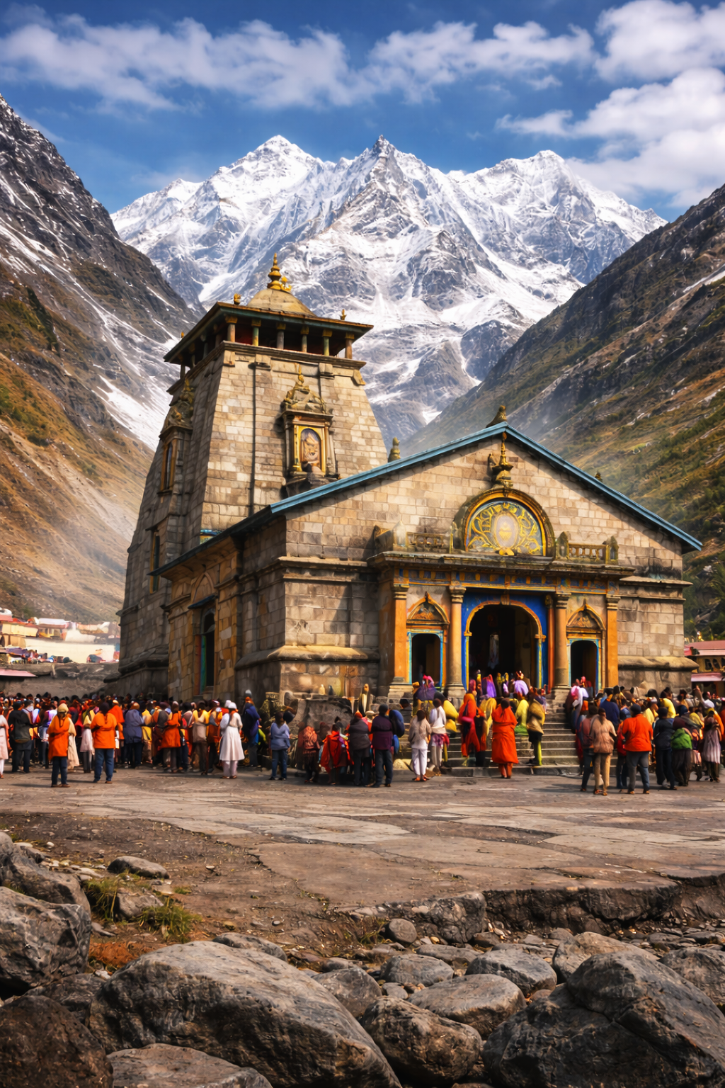 After breakfast, drive to Gaurikund, the sacred threshold of the Kedarnath Yatra, where the Mandakini flows with quiet reverence. According to legend, this is the place where Goddess Parvati performed deep penance to attain Lord Shiva as her divine consort. Pilgrims traditionally pause here to seek blessings, purify themselves, and prepare their minds and hearts for the arduous ascent ahead. From Gaurikund, begin the 19km pilgrimage trek to Shri Kedarnath, undertaken on foot or with the support of pony or doli services (available at additional cost). As the trail rises, the surroundings transform into a powerful blend of raw nature and devotion, roaring streams, prayer chants, and snow-clad peaks testing both faith and endurance. This sacred climb is considered an offering of effort, humility, and surrender to Lord Shiva. On reaching Kedarnath, check in to your accommodation and allow time to rest and acclimatize to the high altitude. Later, proceed for darshan and pooja at the Kedarnath Temple, one of the 12 Jyotirlingas of Lord Shiva and the spiritual crown of the Char Dham Yatra. Standing at over 3,500 meters, this ancient shrine radiates an overwhelming sense of stillness, power, and divine presence. In the evening, visit the Adi Shankaracharya Samadhi, located just behind the temple, honoring the great saint who revived Sanatan Dharma and reestablished Kedarnath as a living pilgrimage. According to legend, Lord Shiva manifested here in the form of a bull, leaving his sacred hump enshrined as the Jyotirlinga. With Nandi eternally guarding the temple, devotees believe that darshan at Kedarnath grants moksha, liberation and eternal union with Lord Mahadev. Overnight stay at Kedarnath, beneath the silent gaze of the Himalayas.Transportation Private transfer (32km, 2 hrs.)Hiking Distance 9 miles / 15 kmWalking time 8 – 9 hoursMax. Elevation 11,755 ft / 3,583 mElevation gain 5,627 ft / 1,715 mDifficulty Very StrenuousAccommodation Premium Guest houseMeals included Breakfast, Lunch & Dinner -